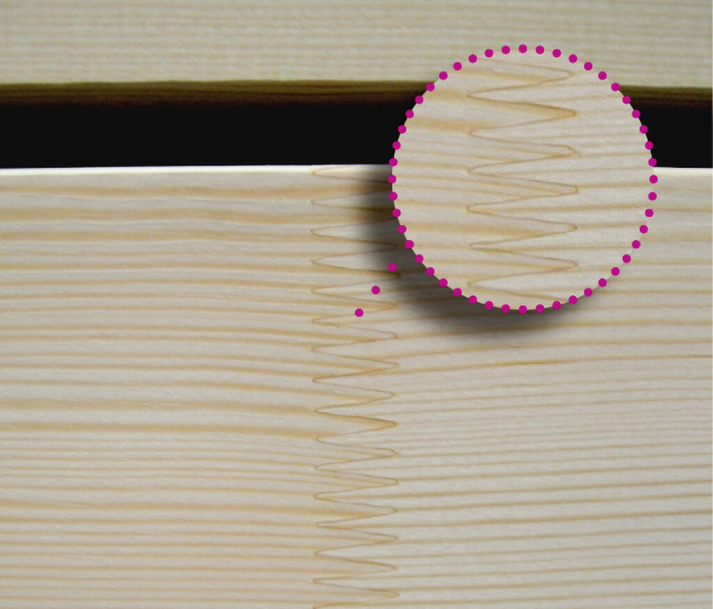 小块木料并非结构整齐的零件。它们包含了木材的不同部分,有些带有裂缝,有些带有斑点,并且颜色也不一样。只有毫无瑕疵的部分才会被选用。这也就是为什么这项工艺需要很高的质量。通常用指接刀接合单片木料。由指接刀完成指接。指接的底部没有缝隙。